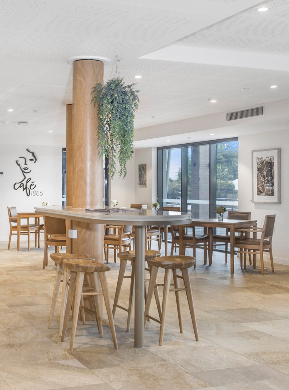 A reinvigorated entry and reception provides connection with the local community, glimpses through to gardens and improved site legibility. The three new buildings combine independent living environments and residential care with shared spaces such as a café and activities hub, which is accessible to the wider community. All buildings connect via multi-use garden spaces including a town square and gallery walkway where local artists can exhibit their work.