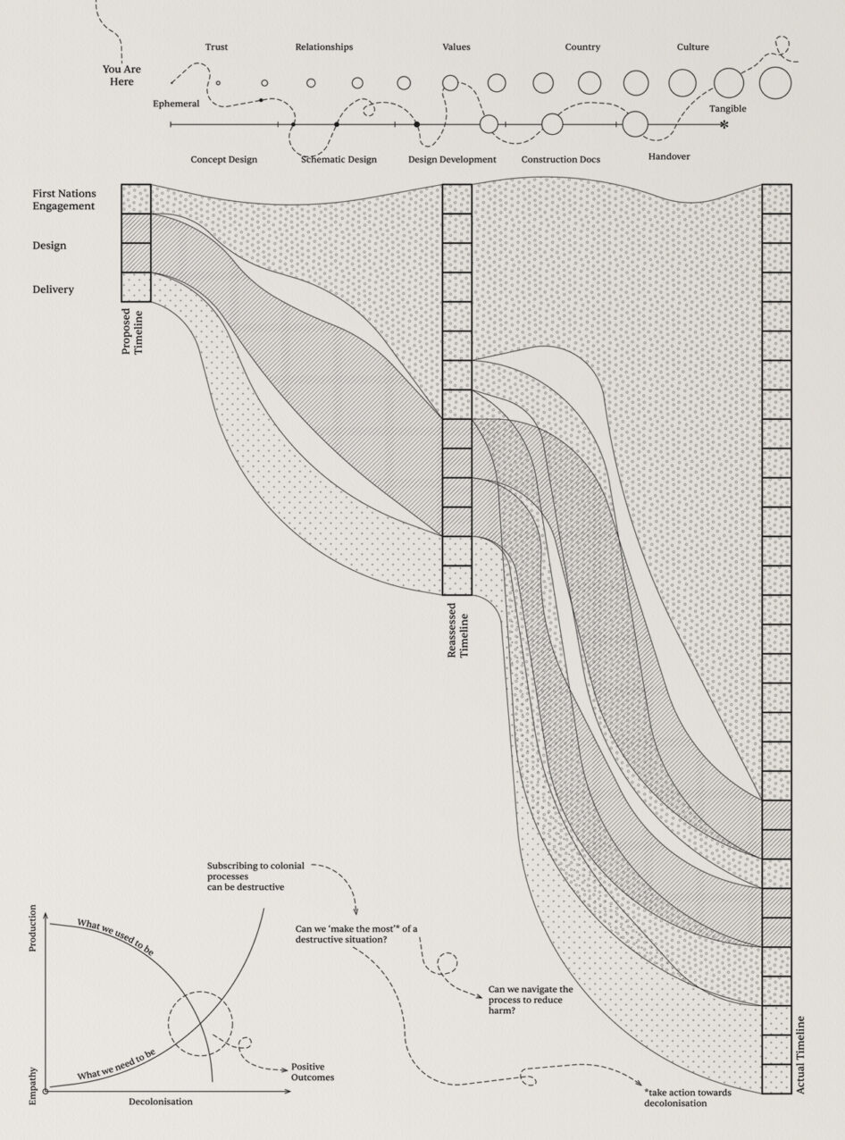 We became documenters and illustrators. Some of the armour that protects us as architects (Gant charts, resourcing and budget) was shed, yet our design time remained the same. Months were spent talking, gaining trust, listening, and learning. Shrinking ourselves drove us into a larger profession of compassion and community. This is a small step in decolonisation. We are a small part of the process. This tactic is not a small task.