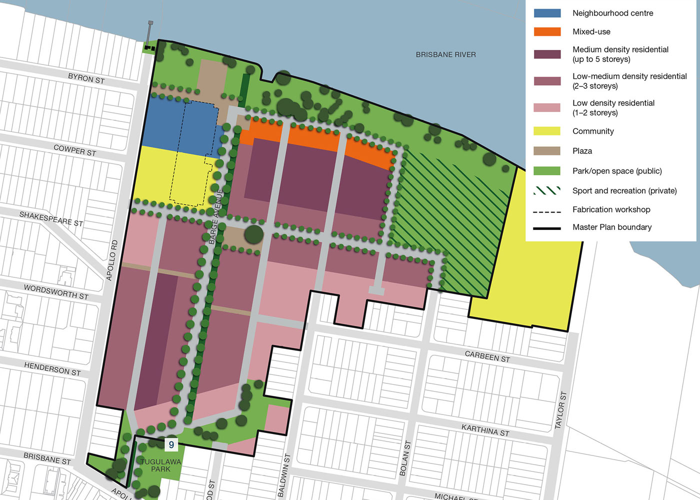 The plan sets the framework for a new neighbourhood which focuses on the riverfront. A landmark within the site is a large historic fabrication workshop, used to construct barges in WWII. The plan retains the workshop within a riverfront retail node. A large public park extends across the entire waterfront providing generous access to the river and a setting for higher density housing to capitalise on this north-facing outlook.