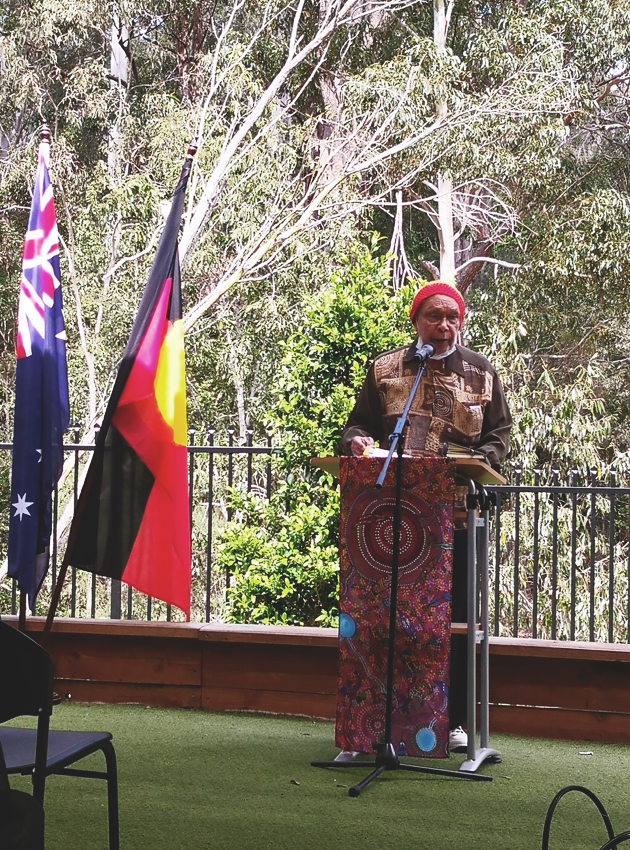 Opening images: 1. Senator Paul Scarr speaking at the Hymba Yumba event; 2. Making their mark — Ipswich Mayor Teresa Harding, Federal Member for Oxley Milton Dick, Hymba Yumba’s Chairperson Karla Brady, Principal Peter Foster and State Member for Jordan, Chris Mullen; 3. DR’s Eloise Atkinson (right) and Khai Jie Ng with patron Uncle Albert.