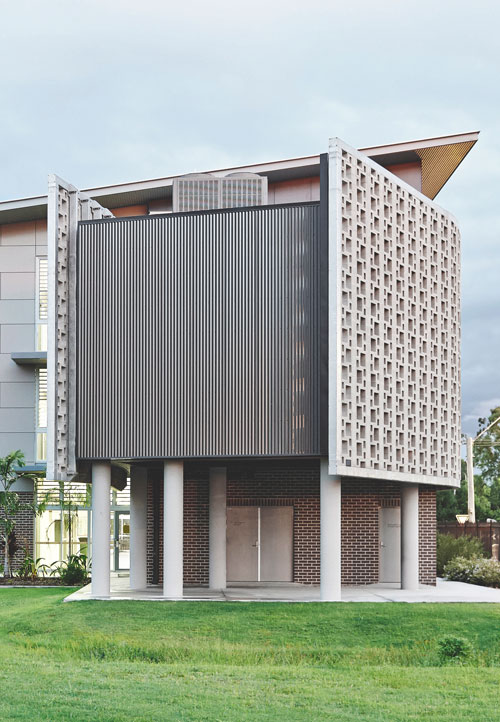 This building projects a strong identity, reflecting the school’s achievements and its pride. A strong street presence was a deliberate strategy and the street facing elevations also provide a protective edge fronting busy Thuringowa Road and Hudson Street. By contrast, the entry and southern elevations invite occupation and connection with the established single-level campus. Here the scale is broken down and the edges softened with built-in seating, covered walkways and open green space.