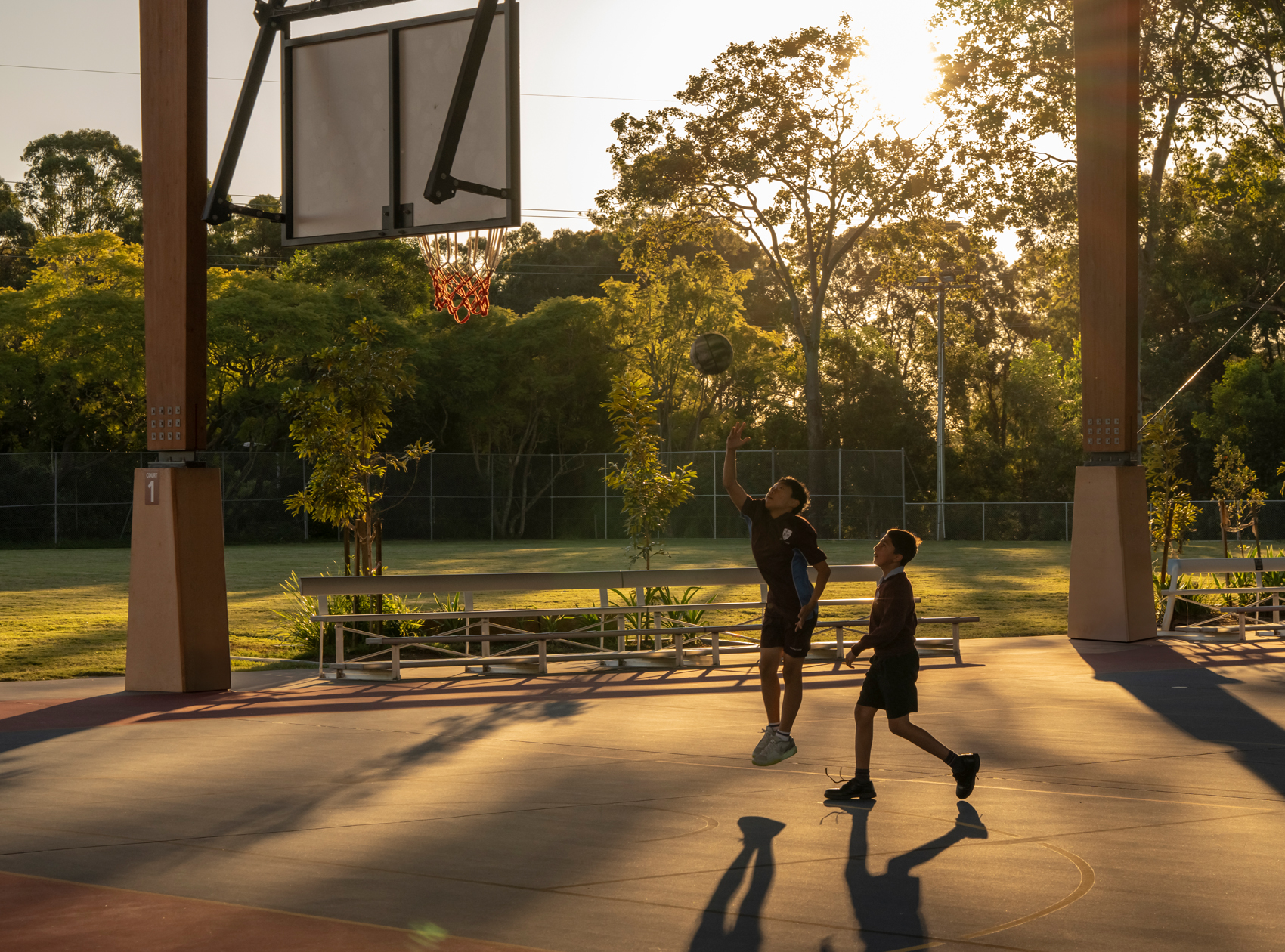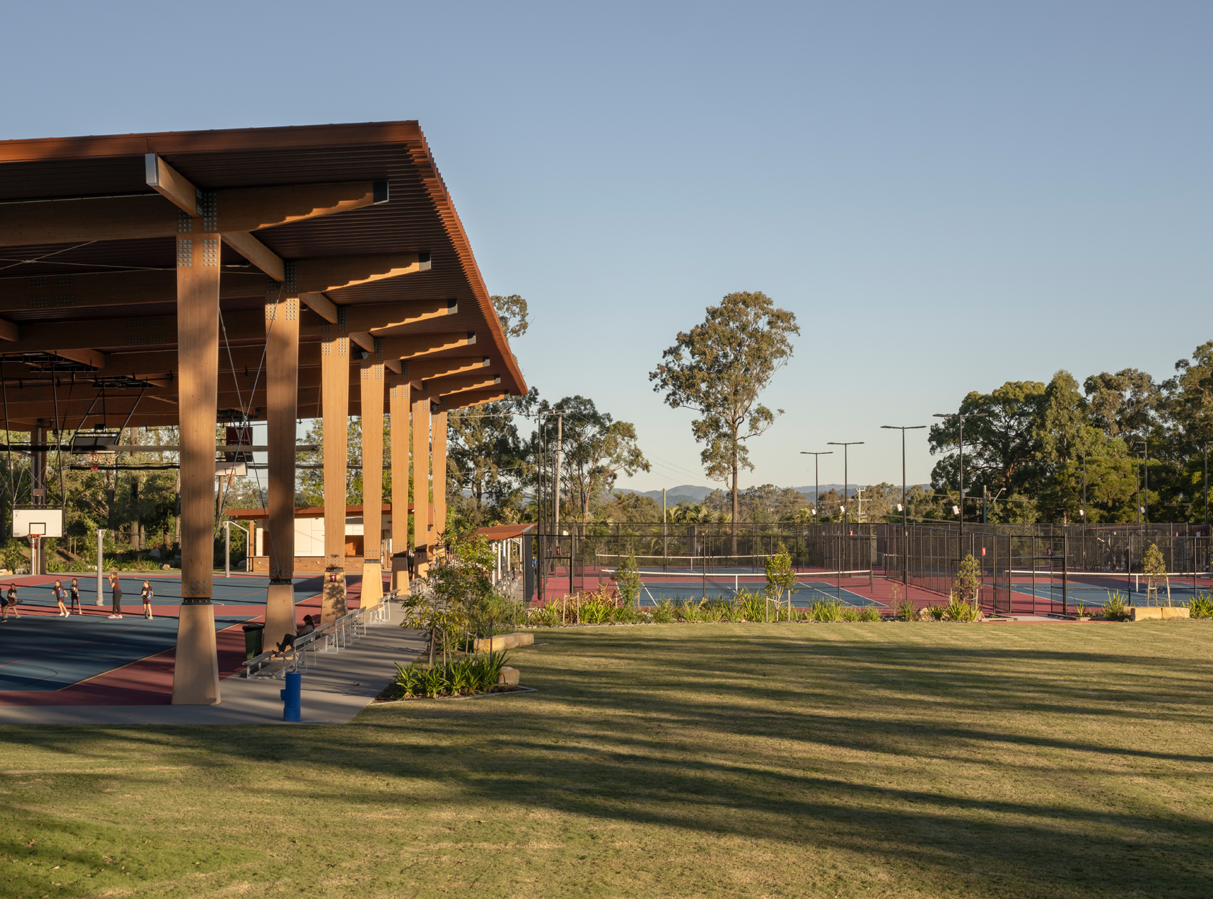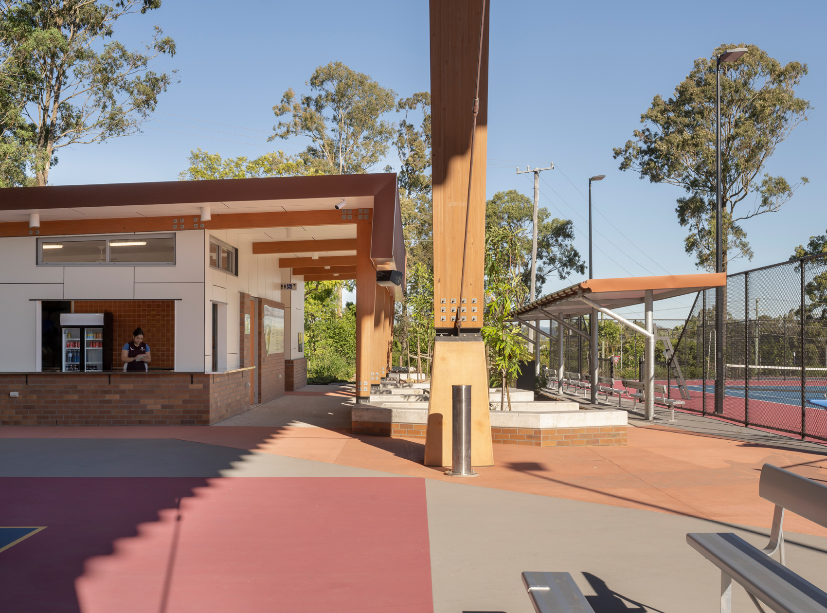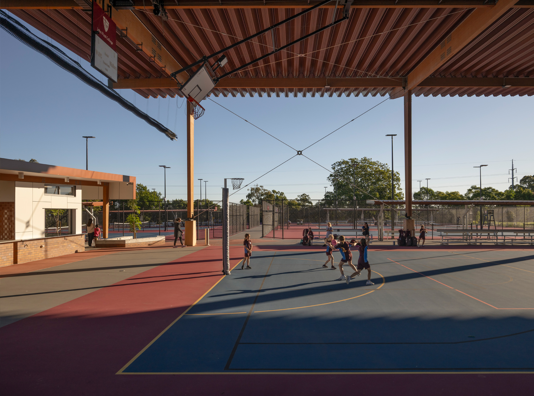 The design contributes to JPC’s aim to strive for sporting excellence, providing six competition grade open tennis courts, two hot shot courts, and two multi-purpose courts. The project is enhanced by the use of Glue Laminated Timber columns and beams to support an expansive roof, providing generous shade to the multi-purpose courts, spectator seating and amenities block.