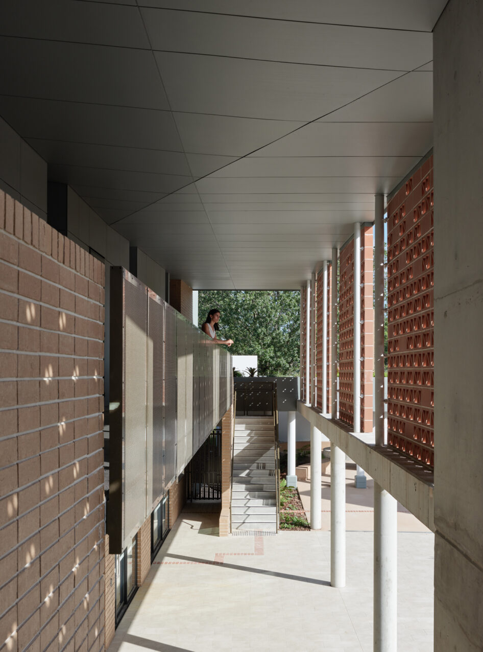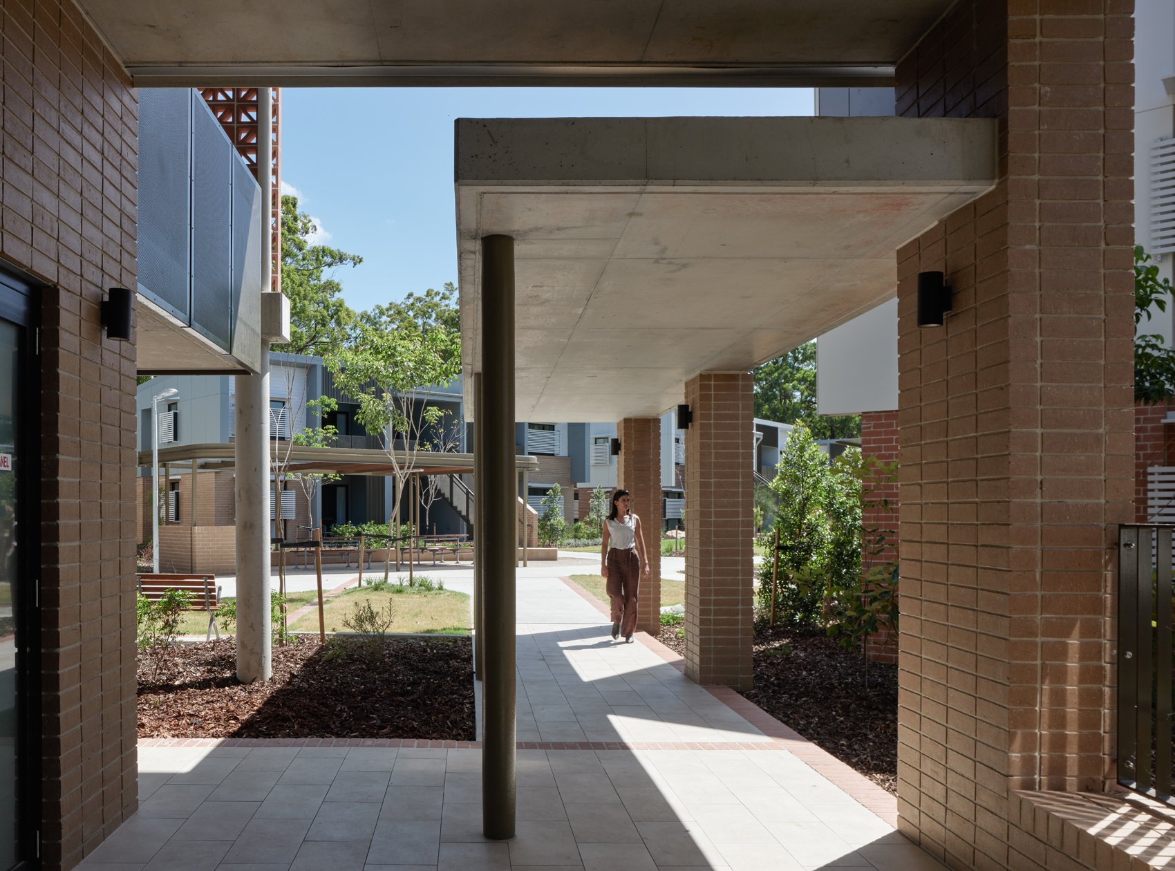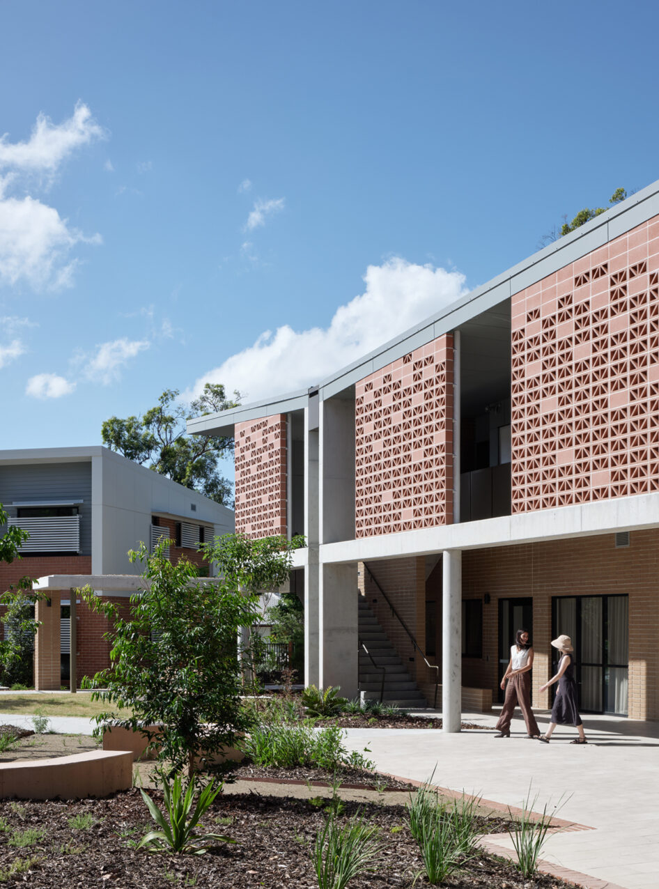 Affordable housing budgets are modest, with value for money a major driving consideration of any capital works program. Robust materials were prioritised throughout, with elevated finishes applied in selected areas where use of natural materials, project specific detailing and defined spatial relationships were deemed to be of benefit to the outcome. The project was intended from the outset to have as little impact on the existing natural environment as possible. This was a directive from both the Department of Housing and the operator given the vegetated location. The layout and design integrate passive design principles, with single loaded buildings with openings allowing for cross ventilation, eliminating the need for mechanical ventilation.