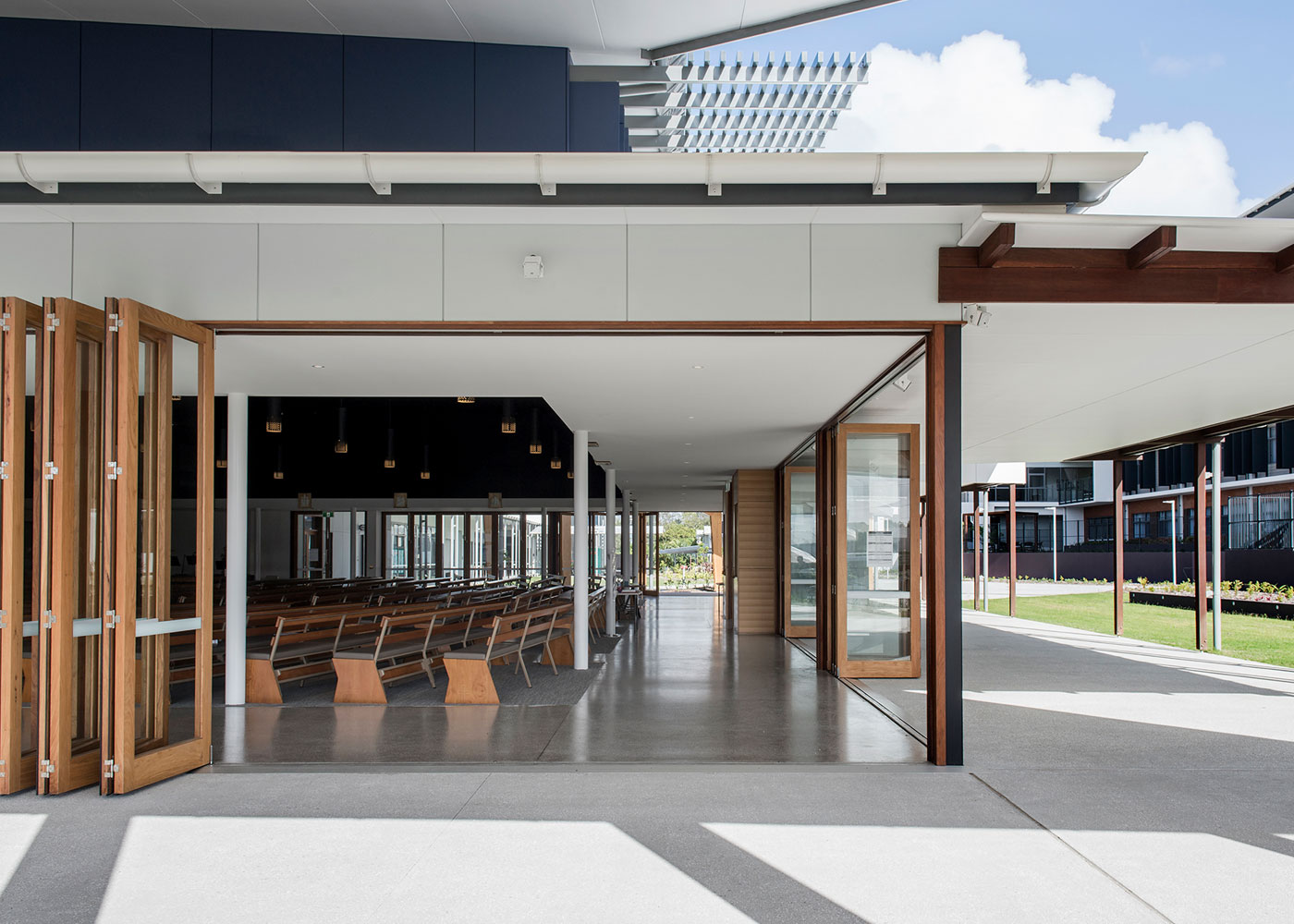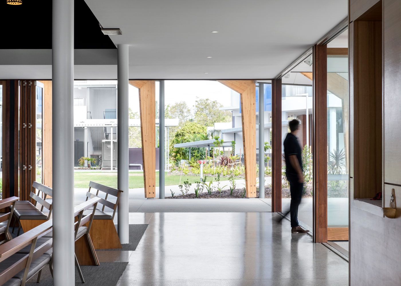 The design of the church responds expressively to its subtropical coastal location, with the interior skirted by generous and deeply shaded space. Marble and brass sanctuary items are set against an interior palette of polished concrete, ply and timber. The interior’s furniture, lighting, screens and sanctuary items were designed by Deicke Richards. The design team worked with artisans and artists who created the hand painted icons and refurbished stations of the cross, locally produced pews (using reclaimed timber from the former church pews) and the cross (carved from a mango tree grown on the site). The sanctuary items were cut from Italian marble and finished by locally based stonemasons.