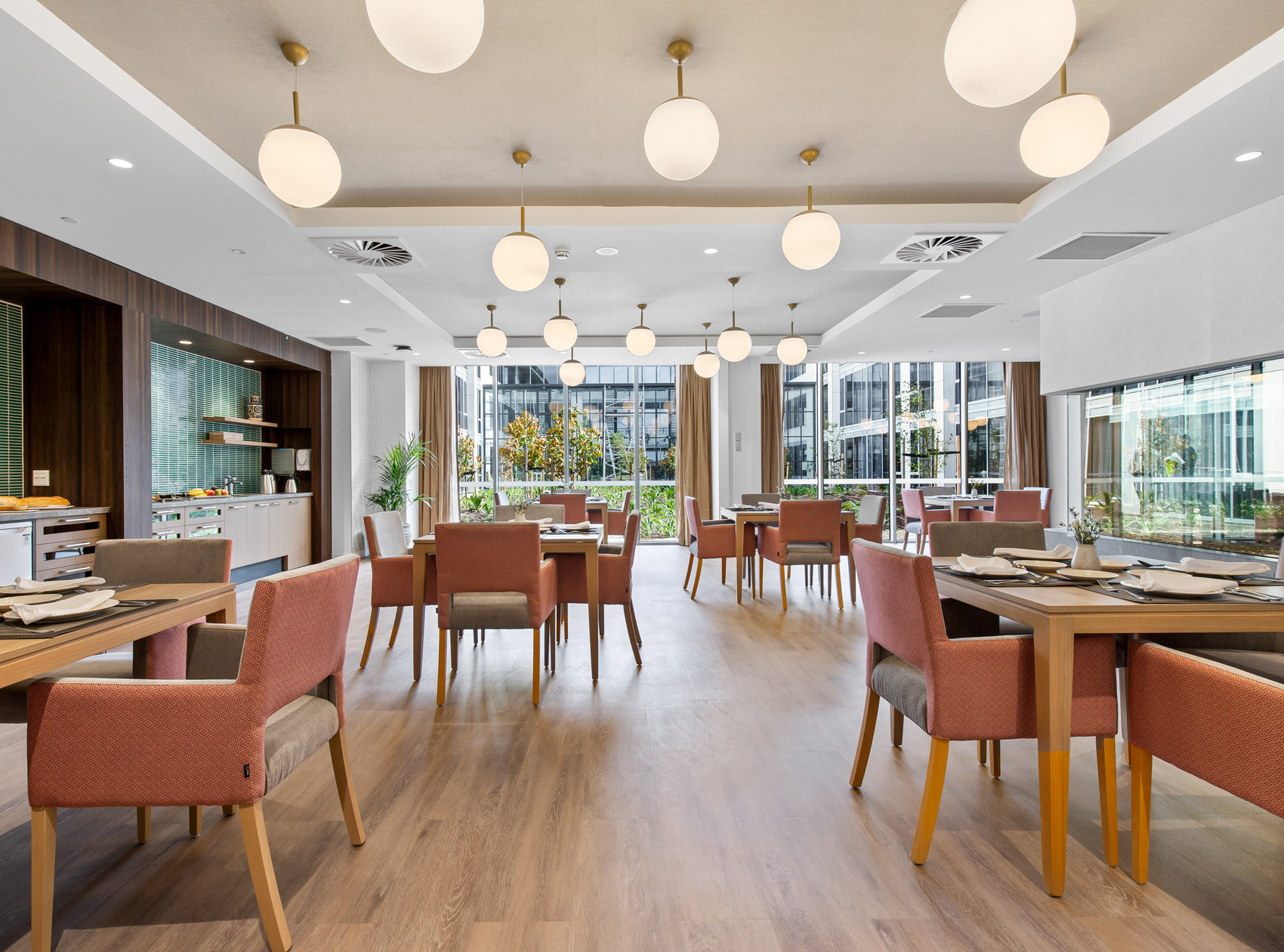 In keeping with allowing residents more flexibility in when and how they spend their day, a grazing bench has been designed within the dining spaces. This allows the residents to make simple meals and snacks throughout the day without having to wait or fit in with official mealtimes. The Williams Landing project is an exciting collaboration with TriCare.