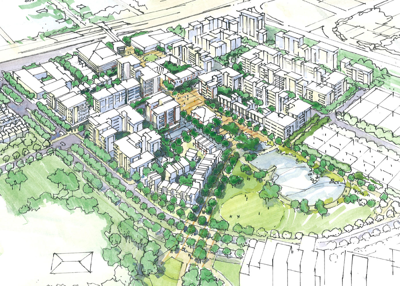 • traffic changes to create a more legible entry and more efficient urban blocks;